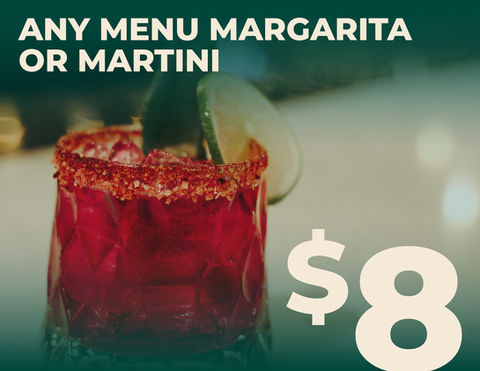 Daily lunch deals for $12 and nightly specials all week — from tacos and martinis to whiskey, wings, and steak night.